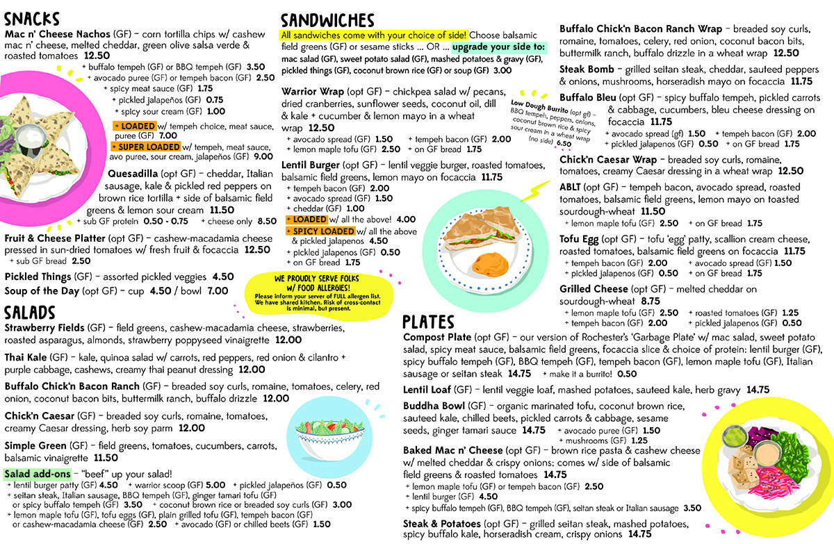 We also offer many gluten-free and allergy friendly options. Plant-based foods are satisfying, flavorful…and free from animal cruelty! We’re excited for you to try our food. Please feel free to contact us with any menu questions.